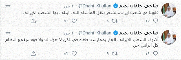وكتب في تغريدات عبر "تويتر" رصدها "المشهد العربي": "اكتوى الشعب الإيراني الجار بممارسة طغاة قم.. لكن لا حول له ولا قوة.. يقمع النظام كل ايراني حر".