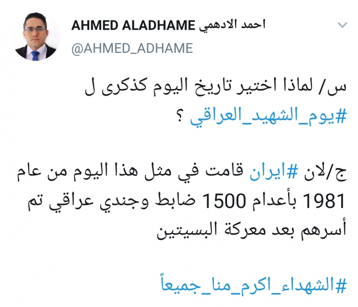 وتساءل "الأدهمي" اليوم، في تغريدة له عبر "تويتر"، ورصدها "المشهد العربي": "لماذا اختير تاريخ اليوم كذكرى ل #يوم_الشهيد_العراقي ؟".