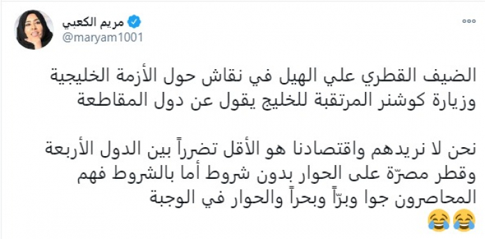 سخرت الكاتبة والإعلامية الإماراتية مريم الكعبي، من المدعو علي الهيل، بسبب حديثه حول الأزمة الخليجية ووصفه أن الاقتصاد القطري الأقل تضررًا.