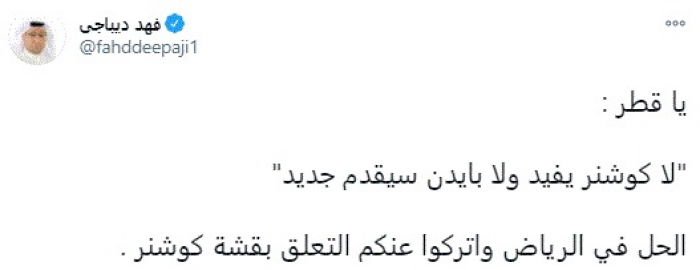 وقال في تغريدة عبر "تويتر" رصدها "المشهد العربي": "يا قطر: لا كوشنر يفيد ولا بايدن سيقدم جديد.. الحل في الرياض واتركوا عنكم التعلق بقشة كوشنر".