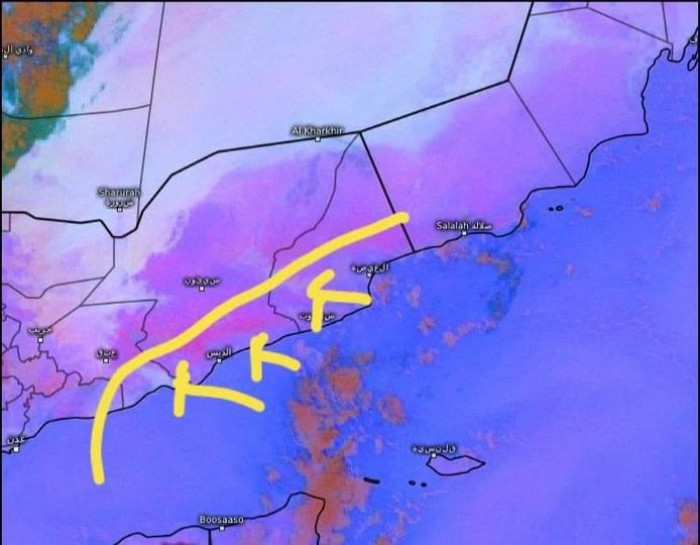 وتقدمت تلك السحب نحو سواحل المهرة وحضرموت وشبوة، وكذلك جنوب شرق أبين.