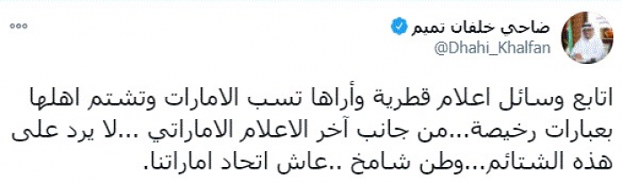 وقال في تغريدة عبر "تويتر" رصدها "المشهد العربي": "أتابع وسائل الإعلام القطرية وأراها تسب الإمارات وتشتم أهلها بعبارات رخيصة... من جانب آخر الإعلام الإماراتي... لا يرد على هذه الشتائم... وطن شامخ ..عاش اتحاد إماراتنا".