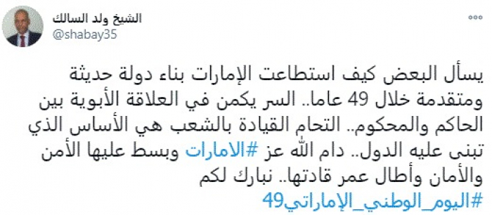 وقال في تغريدة عبر "تويتر" رصدها "المشهد العربي": "يسأل البعض كيف استطاعت الإمارات بناء دولة حديثة ومتقدمة خلال 49 عاما.. السر يكمن في العلاقة الأبوية بين الحاكم والمحكوم.. التحام القيادة بالشعب هي الأساس الذي تبنى عليه الدول.. دام الله عز الإمارات وبسط عليها الأمن والأمان وأطال عمر قادتها.. نبارك لكم اليوم الوطني الإماراتي49".