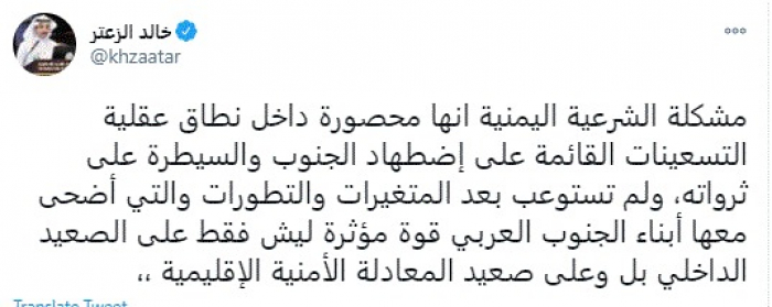 الزعتر: الجنوبيون أصبحوا قوة مؤثرة.. ومشكلة الشرعية في أطماعها بالجنوب