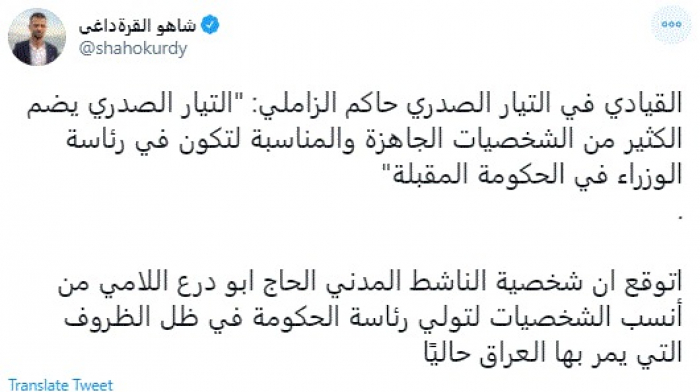 وقال في تغريدة عبر "تويتر" رصدها "المشهد العربي": "القيادي في التيار الصدري حاكم الزاملي التيار الصدري يضم الكثير من الشخصيات الجاهزة والمناسبة لتكون في رئاسة الوزراء في الحكومة المقبلة".