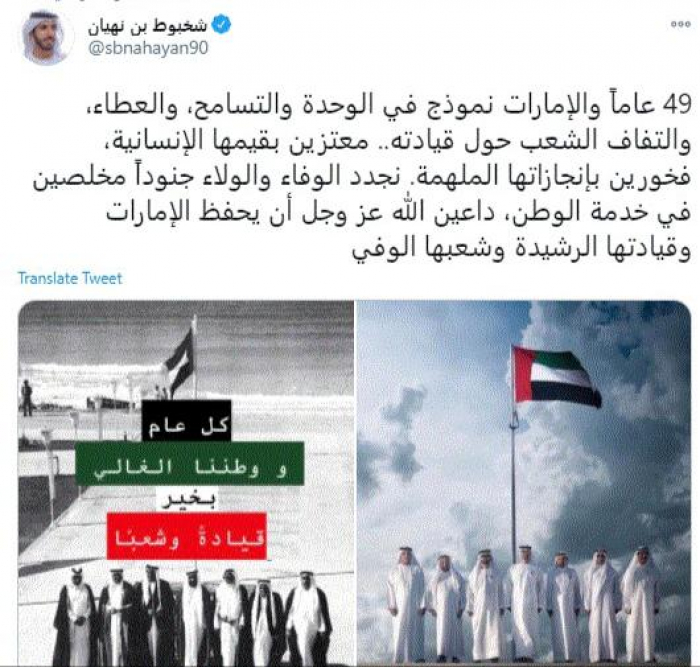 وكتب في تغريدة عبر "تويتر" رصدها "المشهد العربي": "49 عاماً والإمارات نموذج في الوحدة والتسامح، والعطاء، والتفاف الشعب حول قيادته.. معتزين بقيمها الإنسانية، فخورين بإنجازاتها الملهمة".