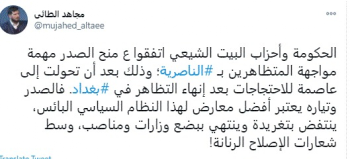 وقال في تغريدة عبر "تويتر" رصدها "المشهد العربي": "مرة يُخيفون المجتمع من عودة البعث ومرة يُخيفون المجتمع من الإرهاب وداعش واليوم يُخيفوه من الجوكرية والفسق والفجور وفي الحقيقة، أكثر ما يُخيف المجتمع هم هؤلاء اللصوص الذين يرتدون عباءة الدولة وفي حقيقتهم لا دولة وميليشيات تتاجر بمستقبل المجتمع وأبناءه".