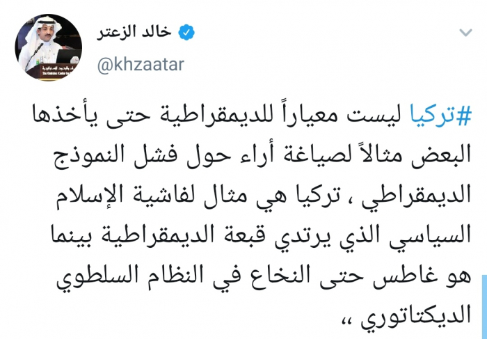 وقال في تغريدة له، عبر "تويتر"، رصدها "المشهد العربي": "تركيا ليست معياراً للديمقراطية حتى يأخذها البعض مثالاً لصياغة أراء حول فشل النموذج الديمقراطي".