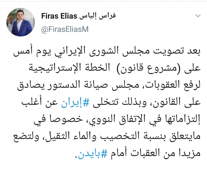 واستكمل إلياس حديثه عن إيران: "وبذلك تتخلى إيران عن أغلب إلتزاماتها في الاتفاق النووي، خصوصًا في مايتعلق بنسبة التخصيب والماء الثقيل، وتضع مزيدًا من العقبات أمام بايدن".