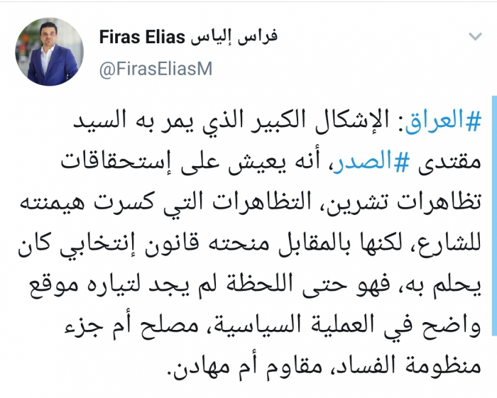 وكتب "إلياس"، في تغريدة له عبر "تويتر"، رصدها "المشهد العربي": " العراق: الإشكال الكبير الذي يمر به السيد مقتدى الصدر، أنه يعيش على إستحقاقات تظاهرات تشرين، التظاهرات التي كسرت هيمنته للشارع، لكنها بالمقابل منحته قانون إنتخابي كان يحلم به".
