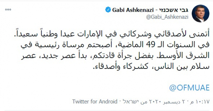 وكتب أشكينازي في تغريدة له نشرها عبر "تويتر"، رصدها "المشهد العربي": "أتمنى لأصدقائي وشركائي في الإمارات عيدا وطنيا سعيدا".