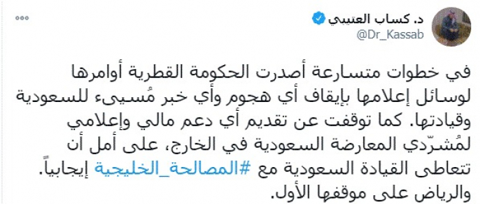 وقال في تغريدة عبر "تويتر" رصدها "المشهد العربي": "في خطوات متسارعة أصدرت الحكومة القطرية أوامرها لوسائل إعلامها بإيقاف أي هجوم وأي خبر مُسيىء للسعودية وقيادتها".