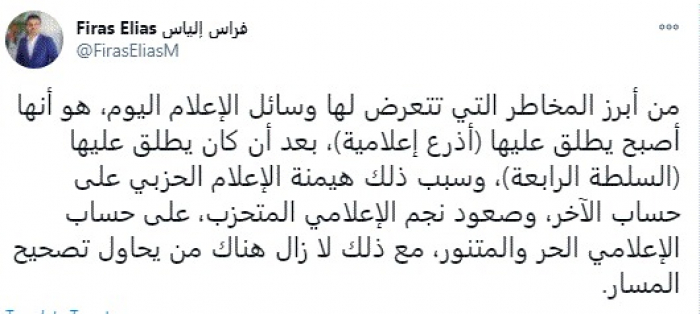 وقال في تغريدة عبر "تويتر" رصدها "المشهد العربي": "من أبرز المخاطر التي تتعرض لها وسائل الإعلام اليوم، هو أنها أصبح يطلق عليها (أذرع إعلامية)، بعد أن كان يطلق عليها (السلطة الرابعة)، وسبب ذلك هيمنة الإعلام الحزبي على حساب الآخر، وصعود نجم الإعلامي المتحزب، على حساب الإعلامي الحر والمتنور، مع ذلك لا زال هناك من يحاول تصحيح المسار".