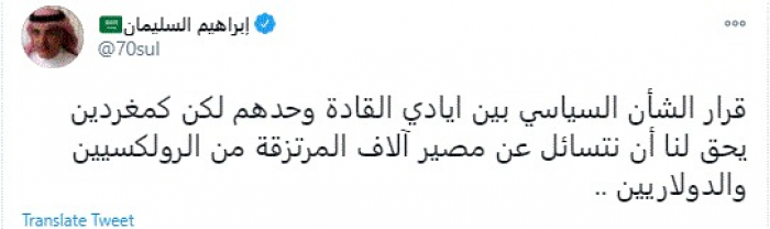 وقال في تغريدة عبر "تويتر" رصدها "المشهد العربي": "قرار الشأن السياسي بين أيادي القادة وحدهم لكن كمغردين يحق لنا أن نتسائل عن مصير آلاف المرتزقة من الرولكسيين والدولاريين".