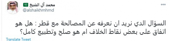 وقال في تغريدة عبر "تويتر" رصدها "المشهد العربي": "السؤال الدي نريد أن نعرفه عن المصالحة مع قطر: هل هو اتفاق على بعض نقاط الخلاف أم هو صلح وتطبيع كامل؟".