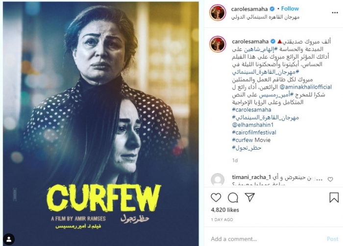 ونشرت كارول، بوستر الفيلم عبر حسابها على إنستجرام، وعلقت: "ألف مبروك صديقتي المبدعة و الحساسة إلهام شاهين، على أدائك المؤثر الرائع.. مبروك على هذا الفيلم الحساس.. أبكيتونا وأضحكتونا".