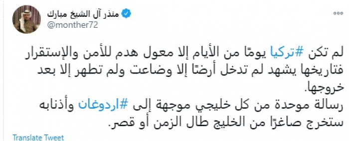 وقال في تغريدة عبر "تويتر" رصدها "المشهد العربي": "لم تكن تركيا يومًا من الأيام إلا معول هدم للأمن والإستقرار فتاريخها يشهد لم تدخل أرضًا إلا وضاعت ولم تطهر إلا بعد خروجها".