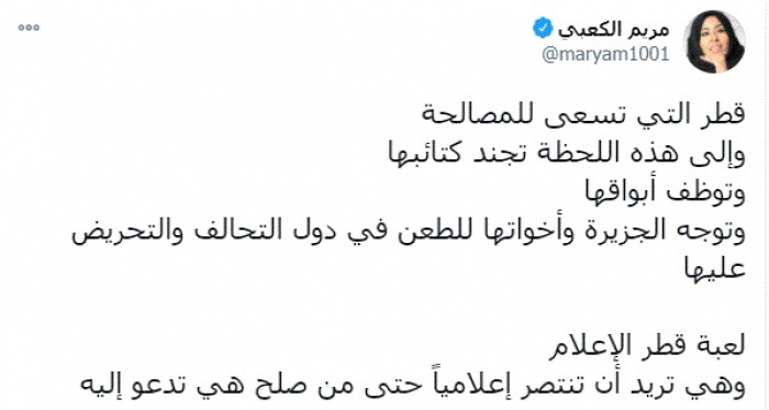 قالت الكاتبة والإعلامية الإماراتية مريم الكعبي، اليوم، إن قطر تواصل توظيف قناة الجزيرة وأبواقها للتحريض على دول التحالف العربي رغم مساعي الدوحة لتحقيق المصالحة معهم.