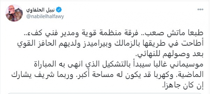 وكتب الحلفاوي، عبر حسابه على تويتر، قائلاً : "طبعا ماتش صعب.. فرقة منظمة قوية ومدير فني كفء.. أطاحت في طريقها بالزمالك وبيراميدز ولديهم الحافز القوي بعد وصولهم للنهائي" .