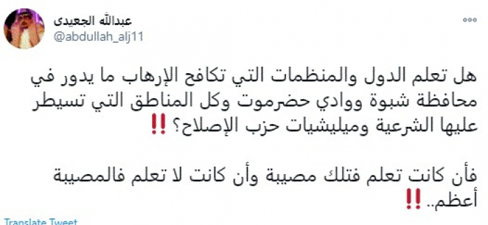 وقال في تغريدة عبر "تويتر" رصدها "المشهد العربي": "هل تعلم الدول والمنظمات التي تكافح الإرهاب ما يدور في محافظة شبوة ووادي حضرموت وكل المناطق التي تسيطر عليها الشرعية ومليشيات حزب الإصلاح؟".