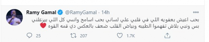 وجه المغني والملحن رامي جمال، رسالة غامضة عبر حسابه على تويتر، لم يوضح من المقصود بها.