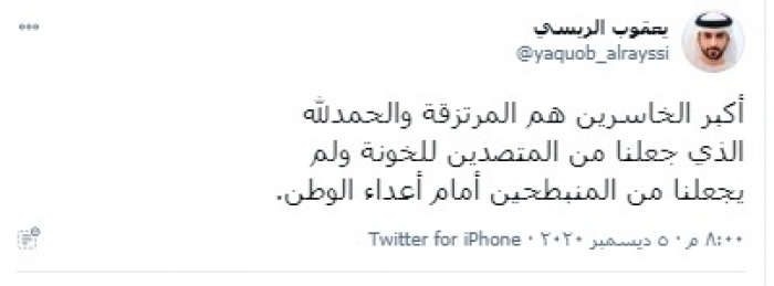 أكد الكاتب الإماراتي يعقوب الريسي، أن المرتزقة وبائعي الأوطان والخائنين هم أكبر الخاسرين.