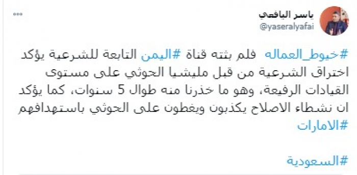وكتب "اليافعي" تغريدة عبر حسابه بتويتر، رصدها "المشهد العربي" قال فيها: "خيوط العمالة فيلم بثته قناة اليمن التابعة للشرعية، يؤكد اختراق الشرعية من قبل مليشيا الحوثي على مستوى القيادات الرفيعة، وهو ما حذرنا منه طوال 5 سنوات، كما يؤكد أن نشطاء الإصلاح يكذبون ويغطون على الحوثي باستهدافهم الإمارات".