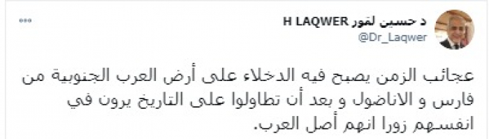 وكتب "لقور" تغريدة عبر حسابه بتويتر، رصدها "المشهد العربي": "عجائب الزمن يصبح فيه الدخلاء على أرض العرب الجنوبية من فارس والأناضول وبعد أن تطاولوا على التاريخ يرون في أنفسهم زورًا أنهم أصل العرب".