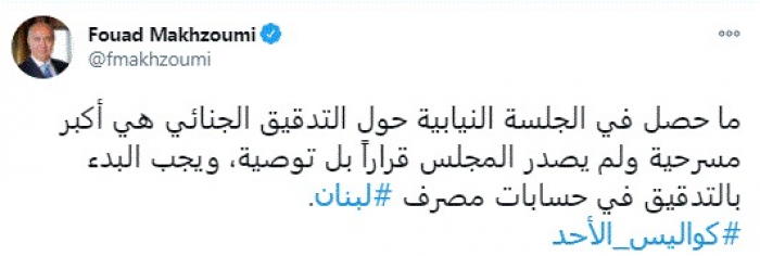وقال في تغريدة عبر "تويتر" رصدها "المشهد العربي": "ما حصل في الجلسة النيابية حول التدقيق الجنائي هي أكبر مسرحية ولم يصدر المجلس قراراً بل توصية، ويجب البدء بالتدقيق في حسابات مصرف لبنان".