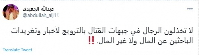وقال في تغريدة عبر "تويتر" رصدها "المشهد العربي": "لا تخذلون الرجال في جبهات القتال بالترويج لأخبار وتغريدات الباحثين عن المال ولا غير المال".