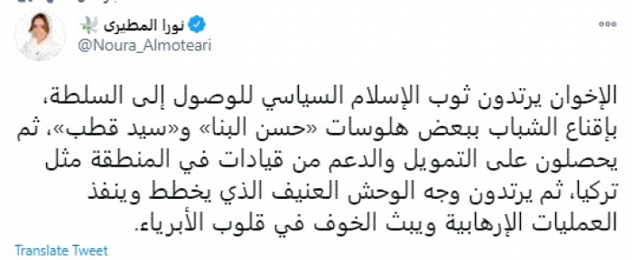 وقالت في تغريدة عبر "تويتر" رصدها "المشهد العربي": "الإخوان يرتدون ثوب الإسلام السياسي للوصول إلى السلطة، بإقناع الشباب ببعض هلوسات حسن البنا وسيد قطب، ثم يحصلون على التمويل والدعم من قيادات في المنطقة مثل تركيا، ثم يرتدون وجه الوحش العنيف الذي يخطط وينفذ العمليات الإرهابية ويبث الخوف في قلوب الأبرياء".
