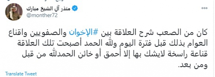 وقال في تغريدة عبر "تويتر" رصدها "المشهد العربي": "كان من الصعب شرح العلاقة بين الإخوان والصفويين واقناع العوام بذلك قبل فترة اليوم ولله الحمد أصبحت تلك العلاقة قناعة راسخة لا يشك بها إلا أحمق أو خائن الحمد لله من قبل ومن بعد".