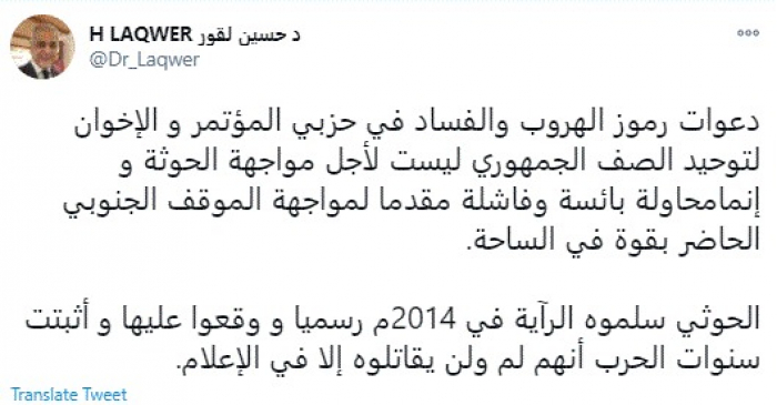 وقال في تغريدة عبر "تويتر" رصدها "المشهد العربي": "دعوات رموز الهروب والفساد في حزبي المؤتمر والإخوان لتوحيد الصف الجمهوري ليست لأجل مواجهة الحوثة وإنما محاولة بائسة وفاشلة مقدمًا لمواجهة الموقف الجنوبي الحاضر بقوة في الساحة".