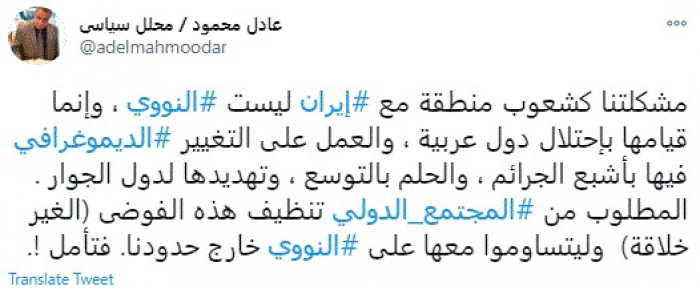 طالب الكاتب والمحلل السياسي الأردني عادل محمود، اليوم، بمواجهة مُخططات إيران في المنطقة العربية.