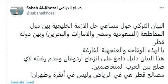 وأضاف: "هذا البيان دليل دامغ على إنزعاج أردوغان وعدم رغبته لأي صلح بين العرب المتغاصمين. مصالح قطر هي في الرياض وليس في أنقرة وطهران".