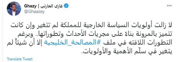 وكتب في تغريدة عبر "تويتر" رصدها "المشهد العربي": "لا زالت أولويات السياسة الخارجية للمملكة لم تتغير وإن كانت تتميز بالمرونة بناءً على مجريات الأحداث وتطوراتها.. وبرغم التطورات اللافته في ملف المصالحة الخليجية إلا أن شيئاً لم يتغير في سلّم الأهمية والأولويات".
