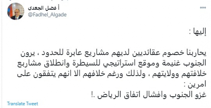 وكتب في تغريدة عبر "تويتر" رصدها "المشهد العربي": "يحاربنا خصوم عقائديين لديهم مشاريع عابرة للحدود، يرون الجنوب غنيمة وموقع استراتيجي للسيطرة وانطلاق مشاريع خلافتهم وولايتهم، ولذلك ورغم خلافهم إلا أنهم يتفقون على أمرين: غزو الجنوب وإفشال اتفاق الرياض".