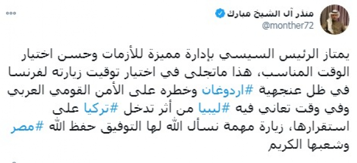 وقال في تغريدة على حسابه بموقع التدوين المصغر (تويتر)، الأحد، إنه: "يمتاز الرئيس السيسي بإدارة مميزة للأزمات وحسن اختيار الوقت المناسب، هذا ماتجلى في اختيار توقيت زيارته لفرنسا في ظل عنجهية أردوغان، وخطره على الأمن القومي العربي".