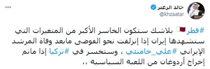 وأضاف في تغريدة على حسابه بموقع التدوين المصغر (تويتر)، اليوم أن: "قطر بلاشك ستكون الخاسر الأكبر من المتغيرات التي ستشهدها إيران إذا إنزلقت نحو الفوضى ما بعد وفاة المرشد الإيراني على خامنئي، وستخسر في تركيا إذا ماتم إخراج أردوغان من اللعبة السياسية".