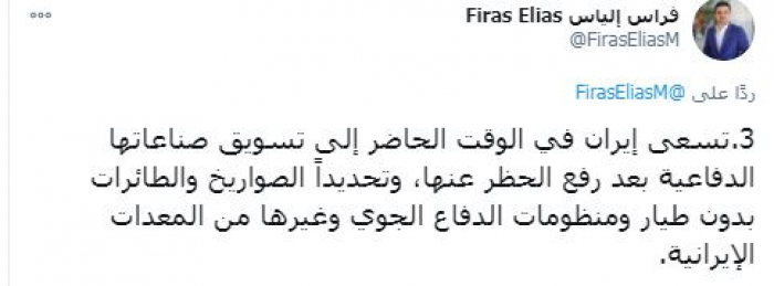 وتابع: "تسعى إيران في الوقت الحاضر إلى تسويق صناعاتها الدفاعية بعد رفع الحظر عنها، وتحديدًا الصواريخ والطائرات بدون طيار ومنظومات الدفاع الجوي وغيرها من المعدات الإيرانية".