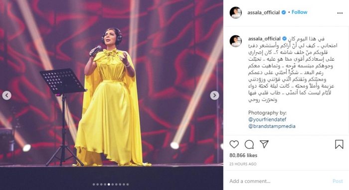 ونشرت أصالة، صورًا من الحفل، عبر حسابها على إنستجرام، وعلقت: "في هذا اليوم كان إمتحاني.. كيف لي أنّ أراكم وأستشعر دفء قلوبكم منّ خلف شاشة؟.. كان إصراري على إسعادكم أقوى ممّا هو عليه".