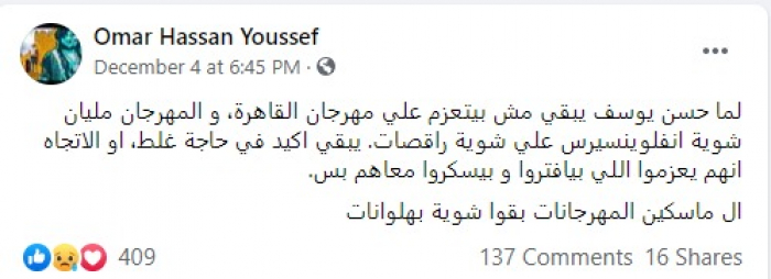 وكتب عمر منشورًا، عبر حسابه الشخصي بموقع "فيس بوك": " لما حسن يوسف يبقي مش بيتعزم علي مهرجان القاهرة، يبقي اكيد في حاجة غلط، اللى ماسكين المهرجانات بقوا شوية بهلوانات".