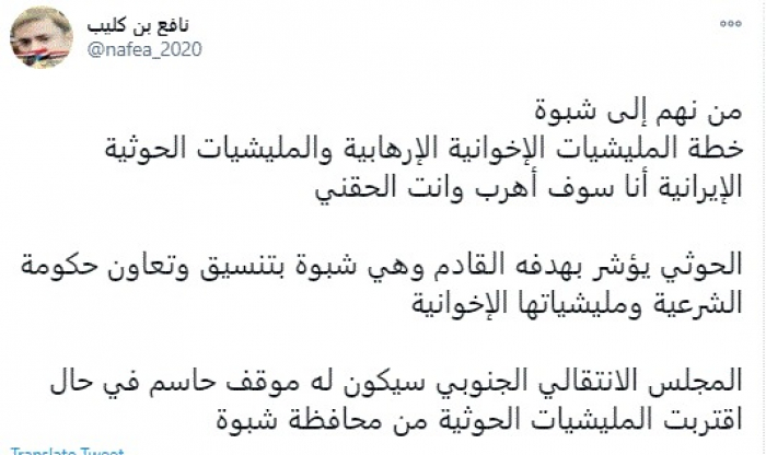 وقال في تغريدة عبر "تويتر" رصدها "المشهد العربي": "من نهم إلى شبوة خطة المليشيات الإخوانية الإرهابية والمليشيات الحوثية الإيرانية أنا سوف أهرب وأنت الحقني".