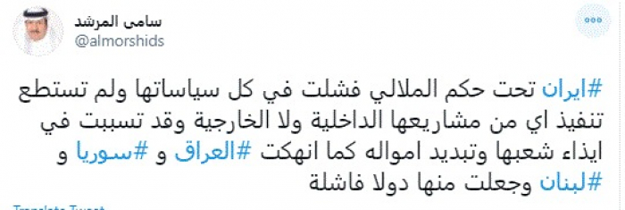 وكتب في تغريدة عبر "تويتر" رصدها "المشهد العربي": "إيران تحت حكم الملالي فشلت في كل سياساتها ولم تستطع تنفيذ اي من مشاريعها الداخلية ولا الخارجية وقد تسببت في ايذاء شعبها وتبديد أمواله كما أنهكت العراق وسوريا ولبنان وجعلت منها دولا فاشلة".