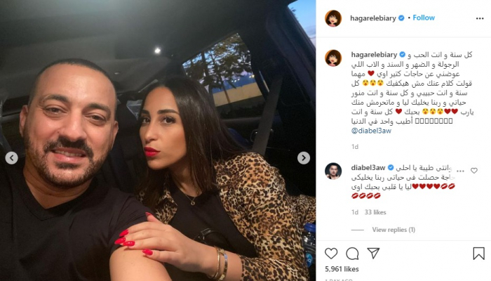 وعلق دياب: " وإنت طيبة يا أحلى حاجة حصلت في حياتي ربنا يخليكي ليا يا قلبي بحبك أوي".