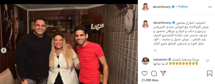 ونشر أكرم، صورًا له من العرض المسرحي، وذلك عبر حسابه على إنستجرام، وعلق: "اتشرفت إمبارح بحضور عرض اللوكاندة مع إخواتي حمدي الميرغني وويزو ودياب وإبرام و نورهان منصور وشريف حسني تحت قيادة المايسترو أشرف عبد الباقي"..