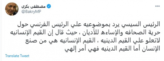 وقال في تغريدة عبر "تويتر" رصدها "المشهد العربي": "الرئيس السيسي يرد بموضوعية علي الرئيس الفرنسي حول حرية الصحافة والإساءة للأديان، حيث قال إن القيم الإنسانية لا تعلو علي القيم الدينية، القيم الإنسانية هي من صنع الإنسان أما القيم الدينية فهي أمر إلهي".