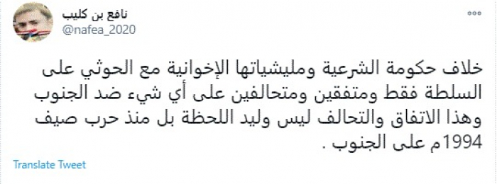 وقال في تغريدة عبر "تويتر" رصدها "المشهد العربي": "خلاف حكومة الشرعية ومليشياتها الإخوانية مع الحوثي على السلطة فقط ومتفقين ومتحالفين على أي شيء ضد الجنوب وهذا الاتفاق والتحالف ليس وليد اللحظة بل منذ حرب صيف 1994م على الجنوب".