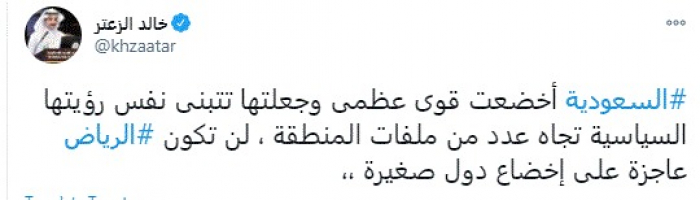 وقال في تغريدة عبر "تويتر" رصدها "المشهد العربي": "السعودية أخضعت قوى عظمى وجعلتها تتبنى نفس رؤيتها السياسية تجاه عدد من ملفات المنطقة، لن تكون الرياض عاجزة على إخضاع دول صغيرة".
