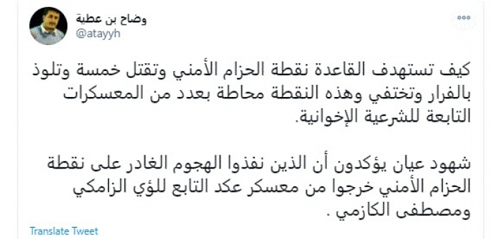 وقال في تغريدة عبر "تويتر" رصدها "المشهد العربي": "كيف تستهدف القاعدة نقطة الحزام الأمني وتقتل خمسة وتلوذ بالفرار وتختفي وهذه النقطة محاطة بعدد من المعسكرات التابعة للشرعية الإخوانية".